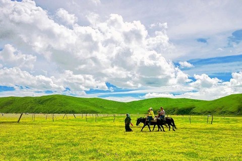 【桑科草原】位于甘肃省甘南藏族自治州夏河境内,距夏河县城拉卜楞西南18公里,有公路直通。桑科草原属于草甸草原,平均海拔在3000米以上,草原面积达70平方公里,是甘南藏族自治州的主要畜牧业基地之一。这里人口少面积大,仅有4000多牧民,草原却辽阔无际,是一处极为宝贵的自然旅游景区。这里设有藏式帐篷接待站两处,每年7-9月搭起藏包,为游客准备新鲜奶茶、糌粑、藏包、手抓羊肉等藏区特色风味,还为游客准备了马匹、牦牛、射击篝火晚会等草原旅游节目。游人在这里可以尽情体味神秘淳朴的藏族风情。