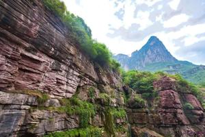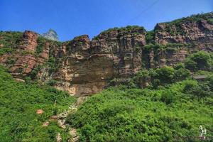 悬崖绝壁,通体透红。高约180米,东西横跨1000多米,上有银瀑高挂,蔚为壮观。