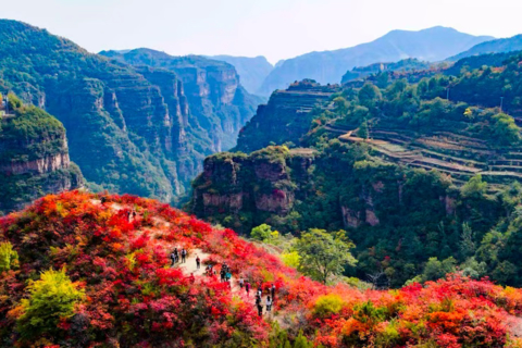 徒步穿越这条金秋太行秘境线路,在众多太行天梯及原始风景区,隐藏在太行4个山水风景包围之中的关后大峡谷,峡谷中四季溪流,泉水,瀑布不断,还有太行著名的救帝沟,太行搭沟梯,太行蚂蚁梯,绝壁天梯,灵鹫峰,小灵山天梯。其中有1个5A八里沟,4A天界山,4A九莲山,4A锡崖沟。还有南太行最高峰十字岭。在户外界徒步穿越太行天梯中,号称《太行天梯五连大穿越》中有太行独有地貌,主要以集溶洞,天瀑,天梯,绝壁,丛林,山川,古道可畏野味十足,空气清新,风景优美,非常适合户外,休闲,徒步,攀爬,穿越,有趣味性,有亮点,有特色,有惊喜哦!!!