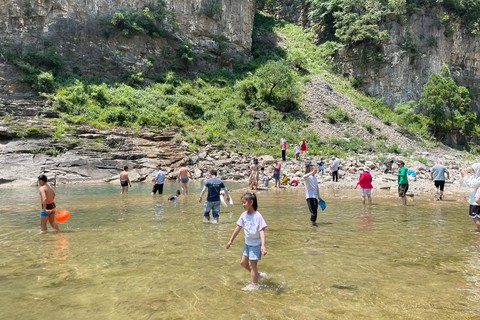 【目的地介绍】:窟窿山位于阳城蟒河镇蟒河大峡谷景区下游,因山腰有一天然孔洞,也叫孔山。下边有一水库为窟窿山水库,这里位于济源与阳城蟒河交界,四周大行群山环绕,高低参差不齐,奇峰林立,水库水如碧玉,山影倒入库面,有北方小桂林之美景。 进入夏季,窟窿山水库水位抬高,绿水溢过坝面,顺势流向下边几十米高的断崖,因中间一峰相间形成两股飞流直下的瀑布景观。沿小路顺峡谷而下,就可以进入济源蟒河水库。附近游人纷纷来此戏水打卡,成了人们休闲避暑好地方。
